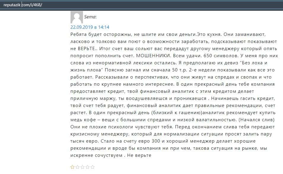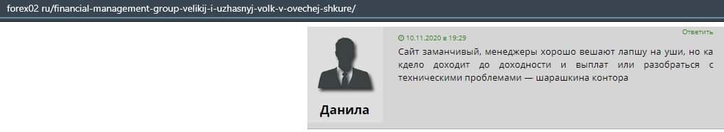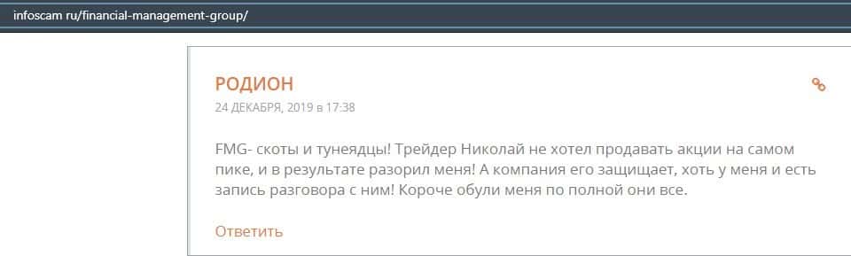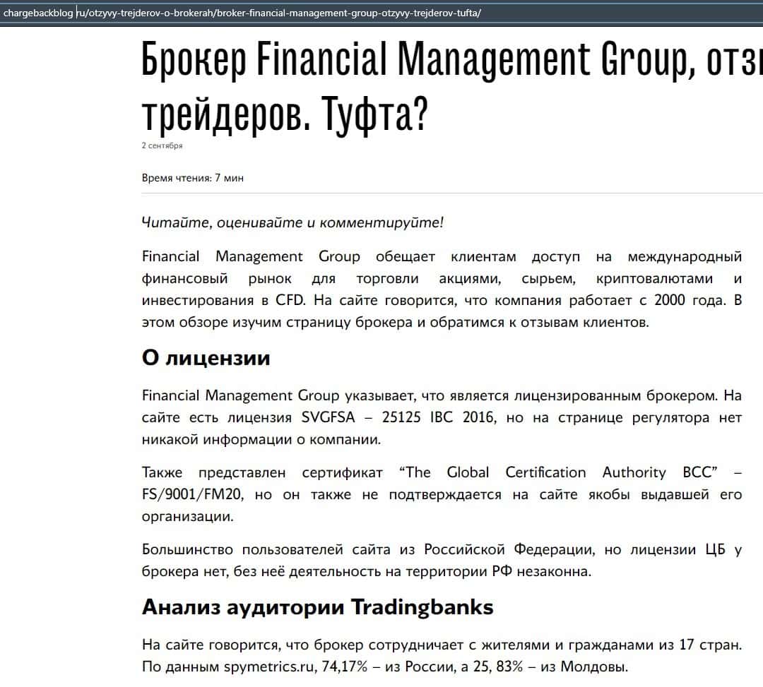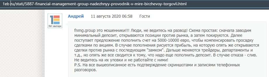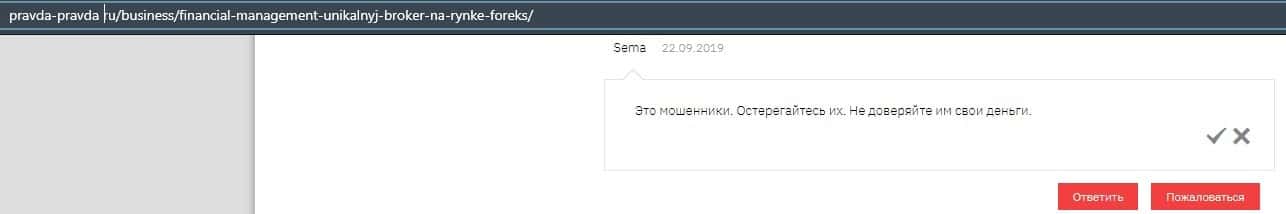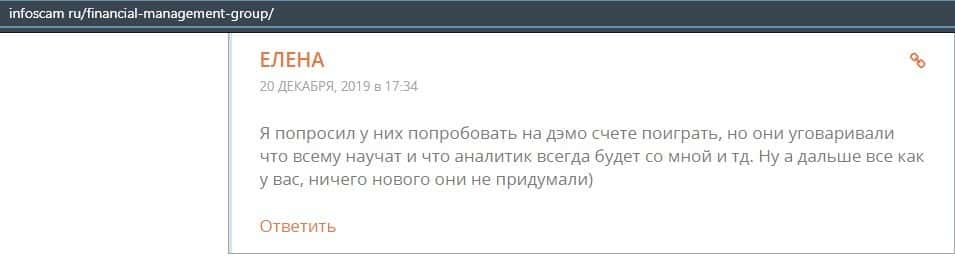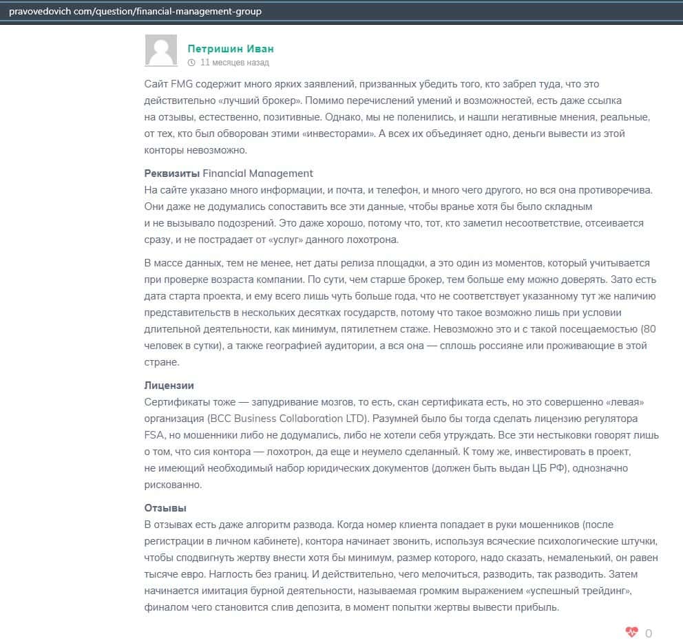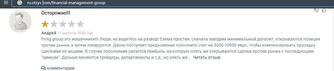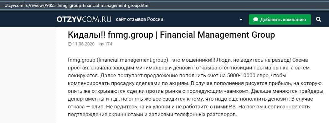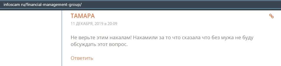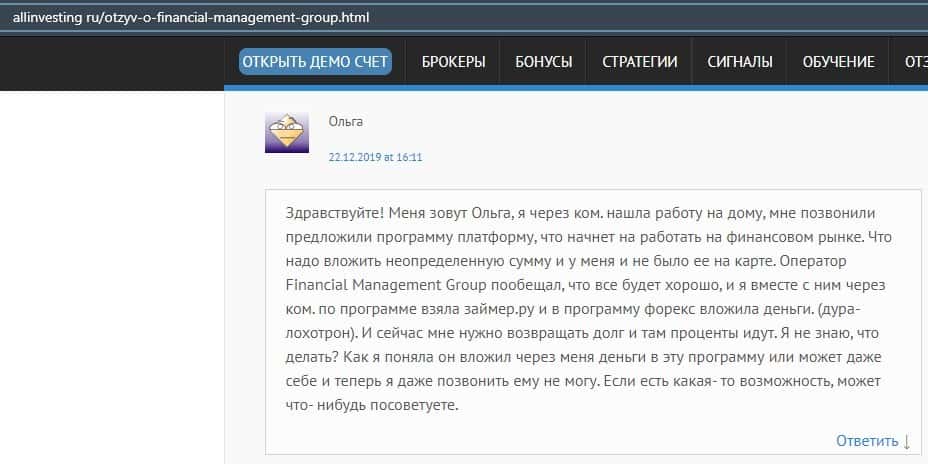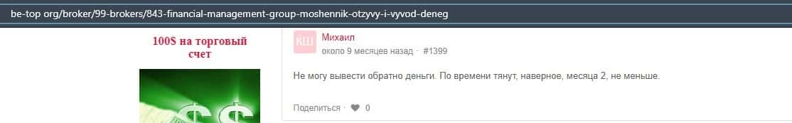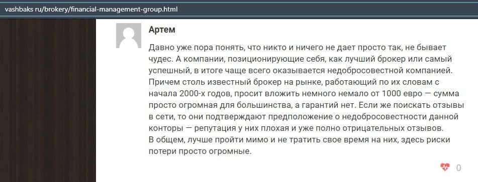 Еще один ресурс высказался не в пользу брокерской конторы Financial Management. Он предупреждает всех о мошенничестве с ее стороны, поэтому не стоит вкладывать свои деньги.