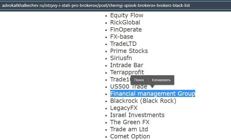 Лохотрон Financial Management попал в черный список брокеров еще одного ресурса. Он находится среди шараг, которые до сих пор работают и которые уже успели соскамиться.