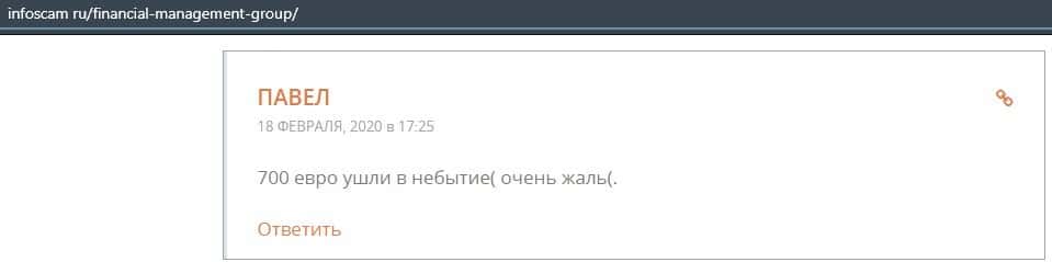 Жертва кидалова пожаловался, что все его вложения в размере 700 евро ушли в небытие. И это случилось после того, как он открыл торговый счет в конторе Файненшил Менеджмент.