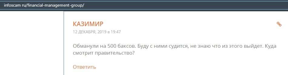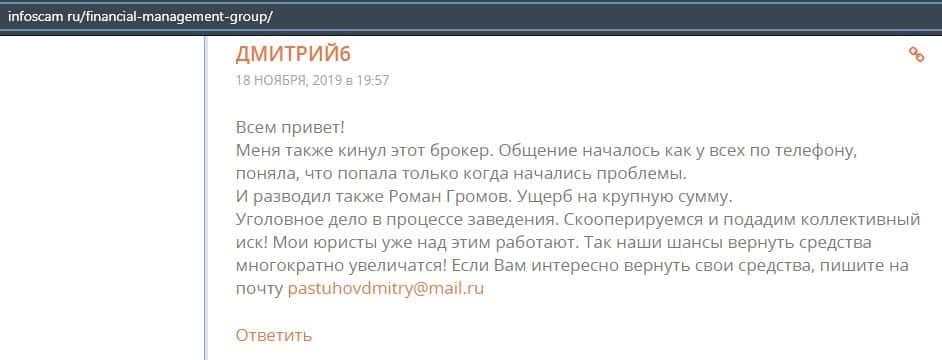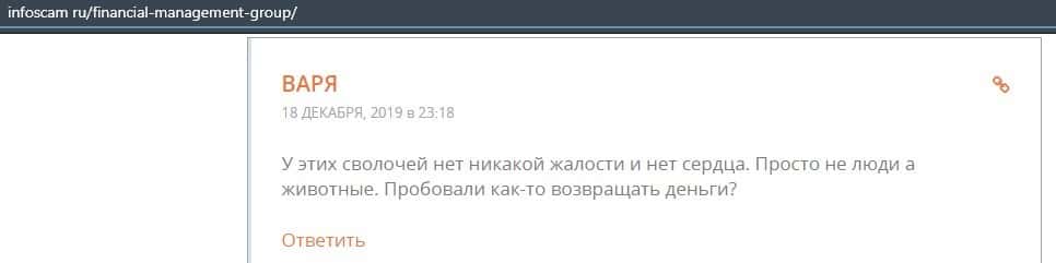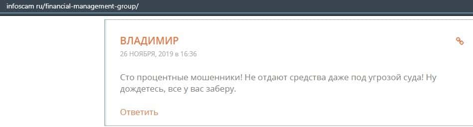 Клиент высказал своем мнение касательно того, что он готов судить с конторой Файненшил Менеджмент до тех пор, пока они не вернут ему деньги. Так что не стоит с ними связываться.