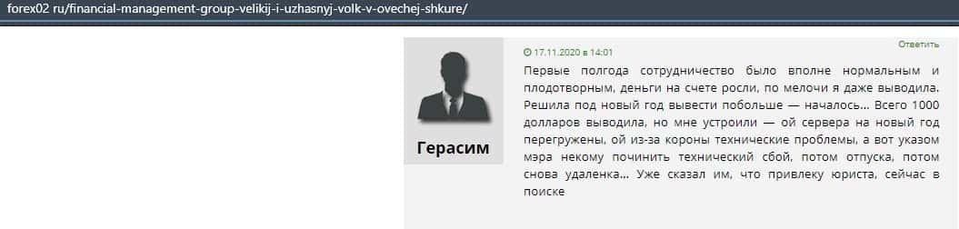 Ниже представлен негативный отзыв касательно деятельности конторы Файненшил Менеджмент. Он указал, что если аферисты не сольют ваш счет, так просто заблокируют вывод.