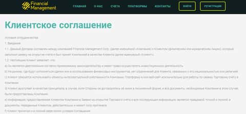 Начинаются условия у мошенников Financial Management довольно неоднозначно, так как клиенты сразу же обязываются принять ряд условий, в которые входят так же условие того, что клиент при регистрации у шулеров Файненшил Менеджмент полностью принимает данное клиентское соглашение.