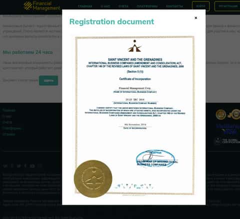 О регулировании и лицензии аферисты Financial Management, не стесняясь, упоминают в множестве разделе сайта, и ставят регулирование в ряд со своими преимуществами. Найти поддельное свидетельство о лицензии можно в одном из разделов сайта, который вы можете увидеть на изображении ниже.