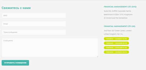 Под контакты шулера Financial Management отвели отдельный раздел, в котором разместили карту с рандомным местоположением и форму связи, по которой нужно связываться с лохотроном Файненшил Менеджмент. Контакты лохотрона Financial Management: