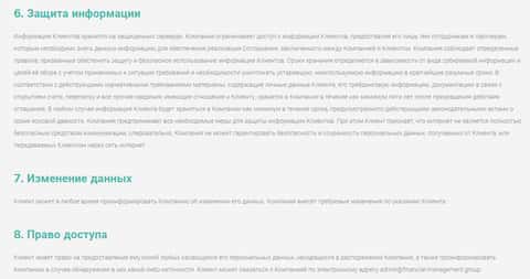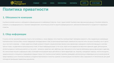 Политика конфиденциальности у мошенников Financial Management ничего толкового из себя по сути не представляет. Стандартно начинается с информации о том, что жулики Файненшил Менеджмент могут в любой момент запросить у клиентов любые необходимые данные.