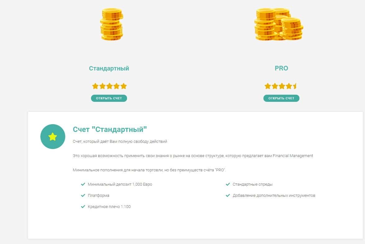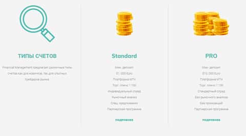 Ну и полностью выдает лохотрон в шулерах Financial Management один из последующих разделов сайта мошенников Файненшил Менеджмент, а именно раздел с типами счетов, имеющихся у аферистов Financial Management, которые вы можете увидеть на изображении ниже.