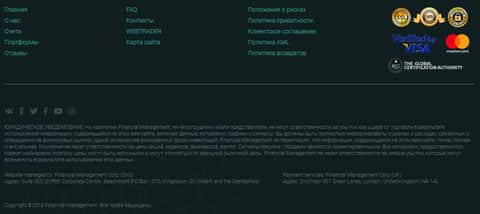 Завершается сайт у мошенников Financial Management типичным меню, с ссылками на различные разделы сайта, а так же предупреждением о рисках, в которых шулера Файненшил Менеджмент сразу же отказываются от ответственности за будущие всевозможные потери средств клиентами.