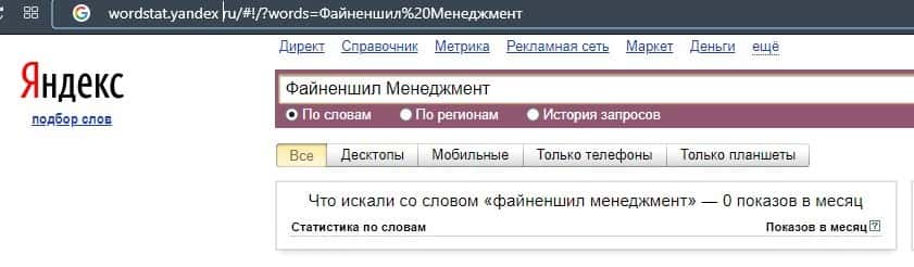 Запрос бренда "Файненшил Менеджмент" в базе Яндекс.Вордстат набрал 0 показов за месяц, поэтому можно смело считать, что в русскоязычном интернете они не популярны.