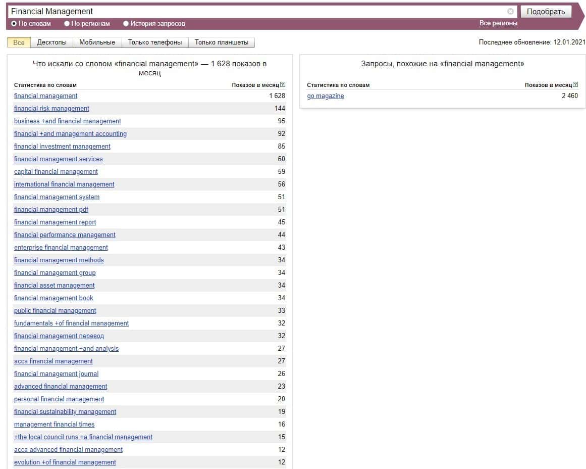 А вот англоязычное название бренда "Financial Management" мошенники распространили в поисковой системе Яндекс и набрали порядка 1628 показов за последний месяц.