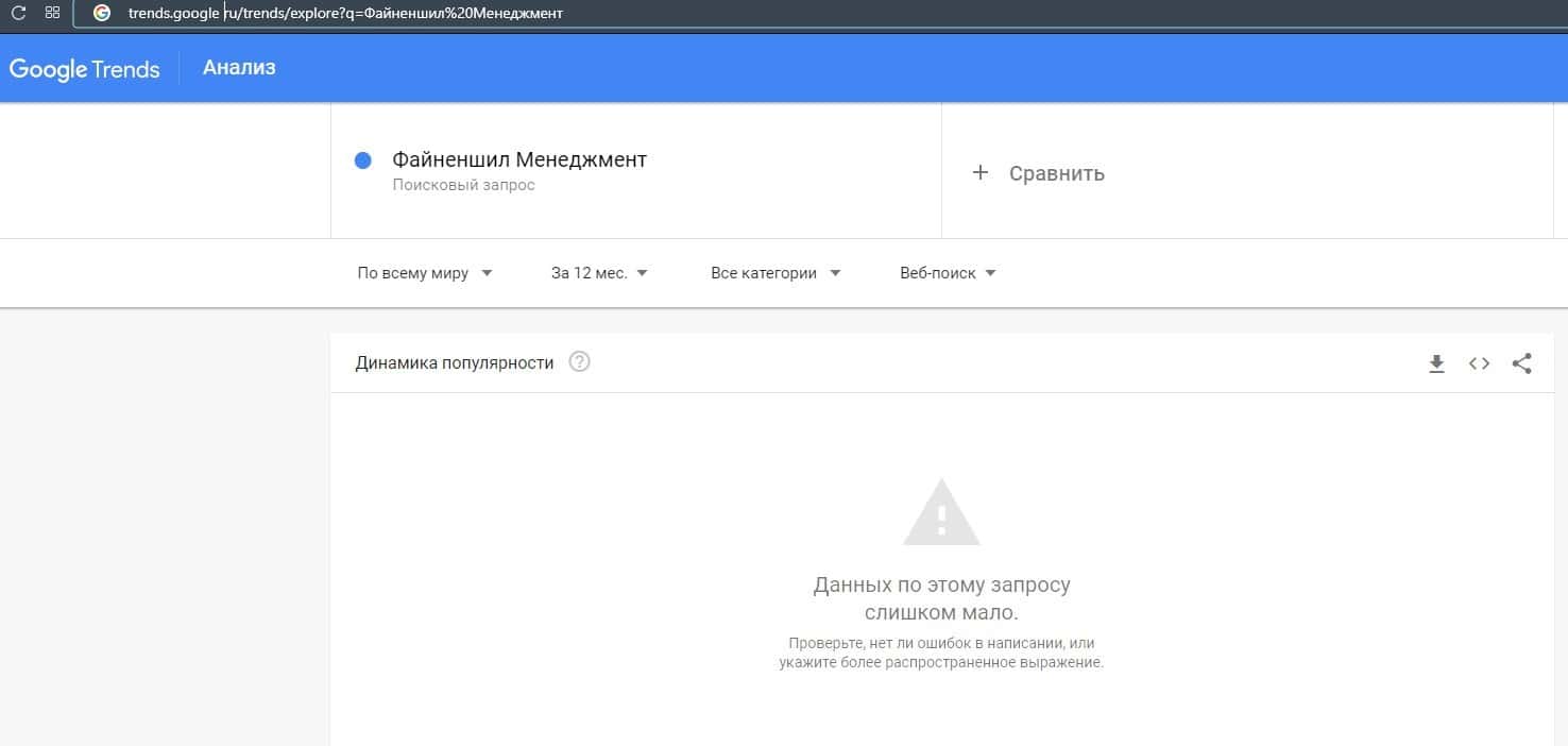 Если рассмотреть запрос бренда "Файненшил Менеджмент" в Гугл Трендс, то здесь система не смогла определить количество запросов из-за их малого количества.