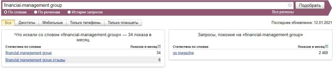 Немного ситуация поменялась, если вместо самого названия лохотрона ввести сайт "financial-management.group". Показатели достигли значения 34 показов за месяц.