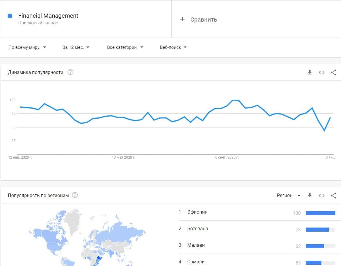 По бренду "Financial Management" статистика присутствует, но опять же Гугл Трендс выделяет контору как популярную и запросы идут из Эфиопии, Ботсваны, Малави и Сомали.
