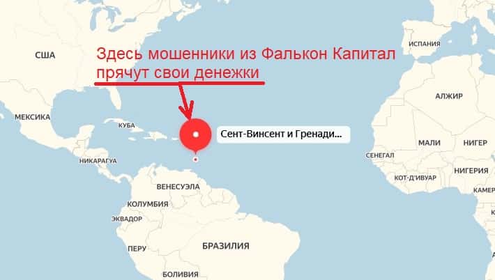 Далеко забрались жулики из дилинговой компании Фалькон Капитал, чтобы надежно припрятать наворованные деньги и, в случае чего, уйти от ответственности. Они прописались в оффшорной зоне Сент-Винсент и Гренадины, на расстоянии более 15 тысяч километров от России, где они проворачивали свои грязные аферы.