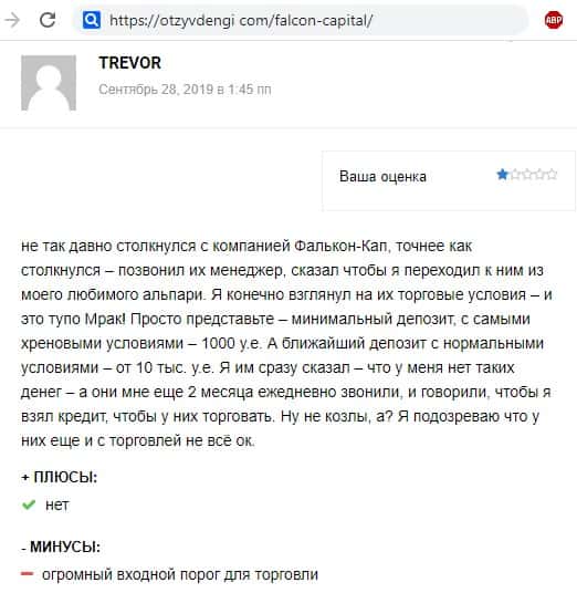 Трейдер жалуется на сайте allinvesting ru на непомерно высокие ставки начальных депозитов в Фалькон Капитал