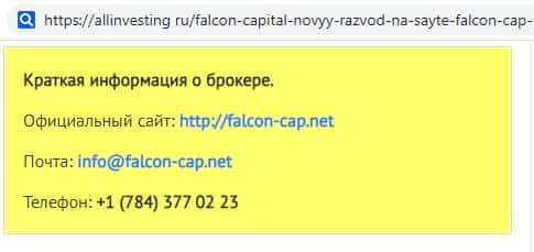 Официальный сайт мошеннической брокерской компании FalconCapital пропал из поля зрения поисковиков, но на информационном интернет-ресурсе allinvesting нашлась некоторая информация об этом брокере мошеннике. Правда, ссылка на данный веб-ресурс, приведенная там, не работает.