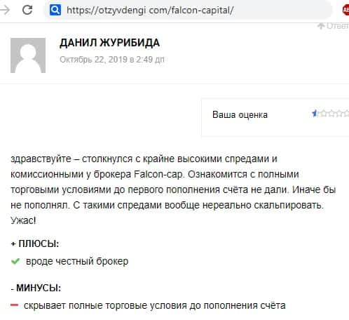 Обиженный трейдер пожаловался на странице сайта allinvesting ru о том, что у мошенников из компании Фалькон Капитал установлены ужасно высокие спреды и комиссионные, причем узнать об этих кабальных условиях можно только после того, как сделаешь первоначальные инвестиции.