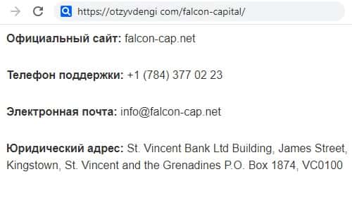 Контактная информация для связи с администрацией брокерской форекс-организации FalconCapital получена от постороннего источника otzyvdengi com, так как официальный сайт этого сомнительного брокера недоступен: