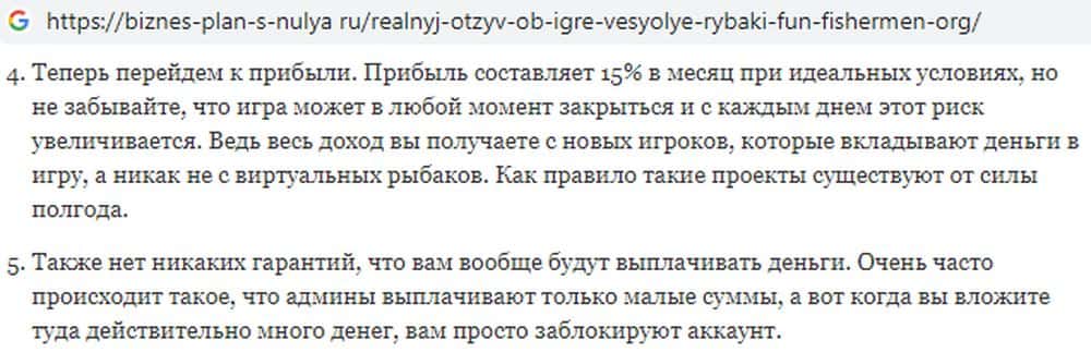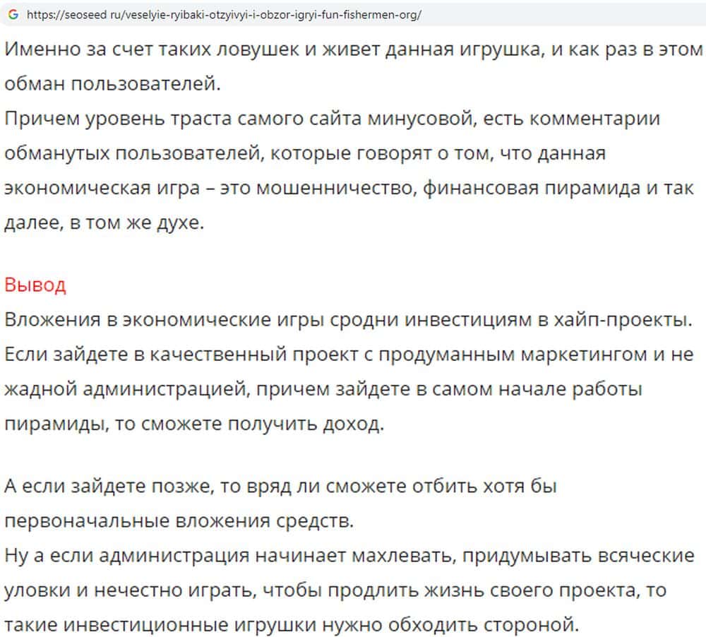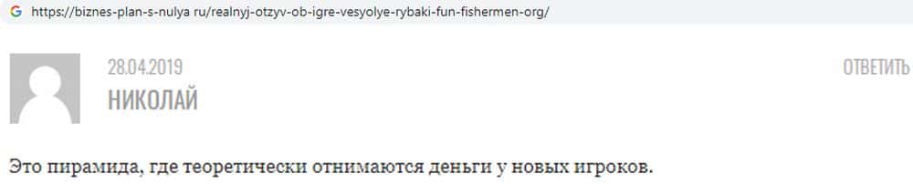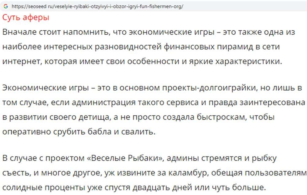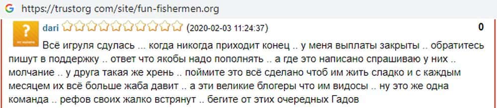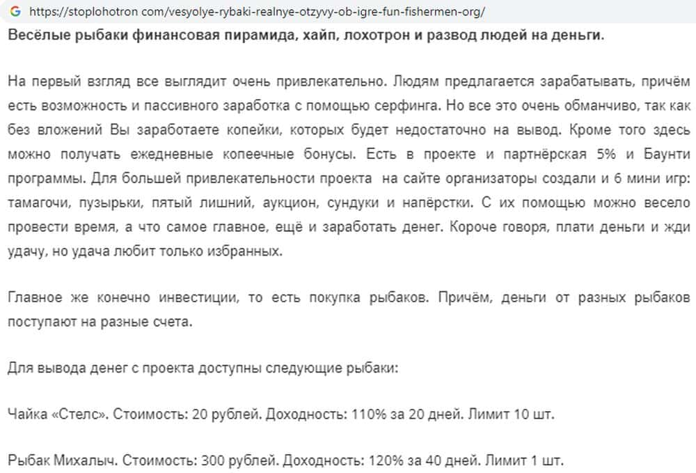 На портале trustorg com пользователи делятся мнением о новом хайп-проекте Fun-Fishermen Org. Это обычная финансовая пирамида, завуалированная аферистами под игру. К сожалению, весь интернет усеян положительными отзывами, под которыми как бы между делом есть реферальные ссылки. Многие, не замечая этого, попадают в ловушку.