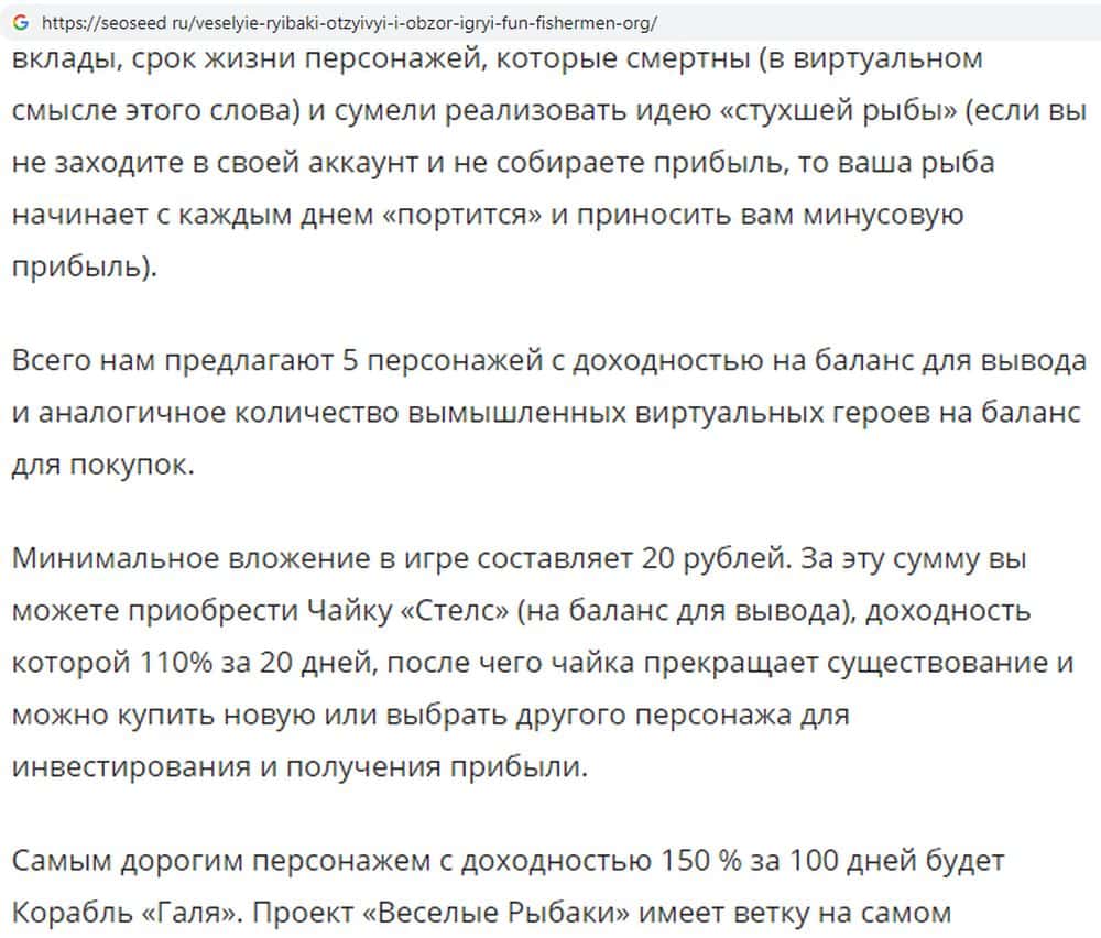 Обращает внимание на ловушки и подводные камни в онлайн приложении махинаторов Fun-Fishermen Org и веб-сайт seoseed ru. Псевдо-игру постоянно приходится донатить, так как срок жизни персонажей ограничен; их стоимость достигает 10000 рублей. При этом прибыль может "портиться" и "съедать" до 50% депозита.