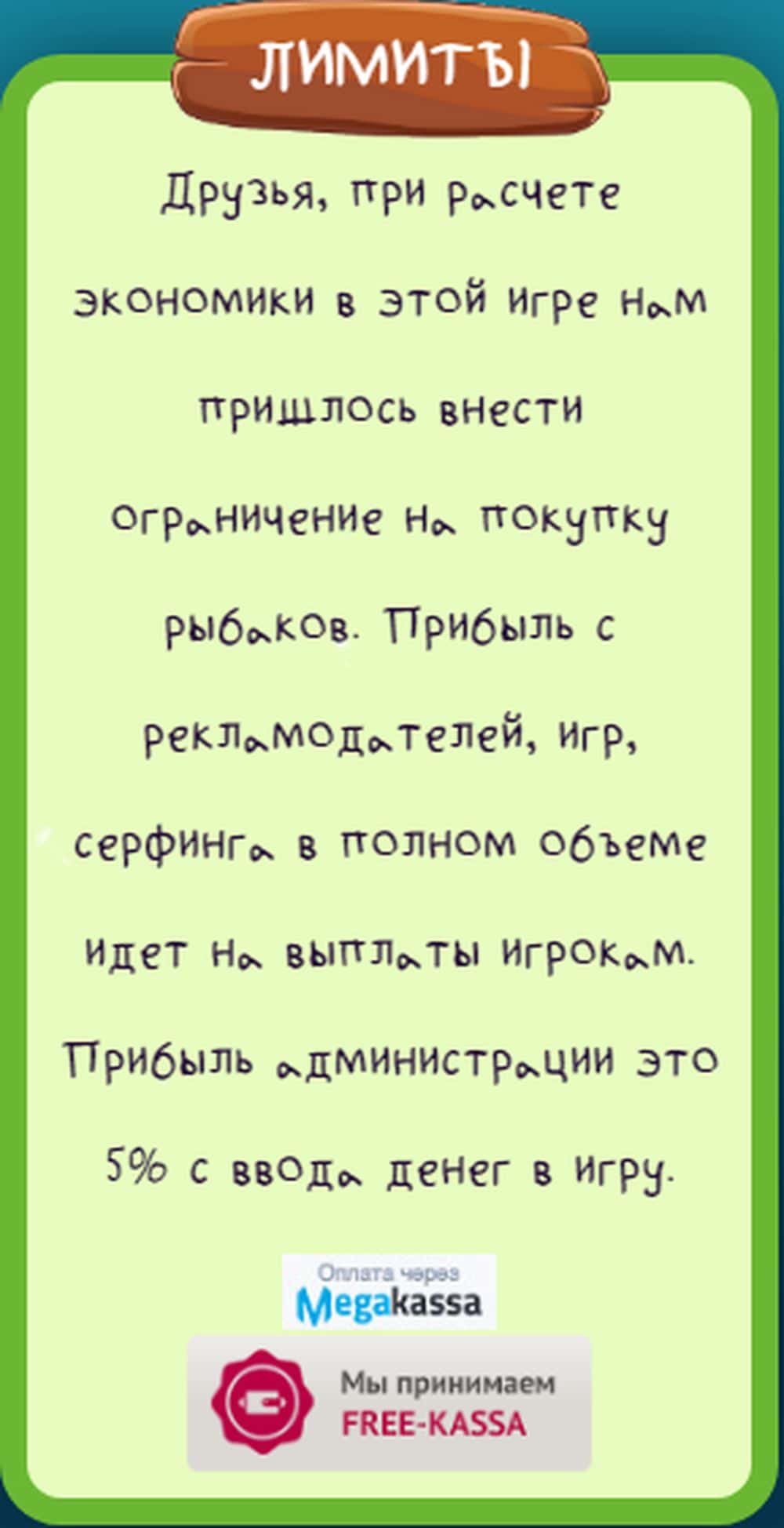 При этом инвестор должен согласиться на то, что вся игра-лохотрон Fun-Fishermen Org усеяна ловушками, съедающими депозит. На вывод работают только несколько персонажей, и то не самых доходных, и купить их можно только за реальные деньги, а не за рыбу. Все остальное - массовка, которая прикрывает пирамиду и обеспечивает доход хозяевам.