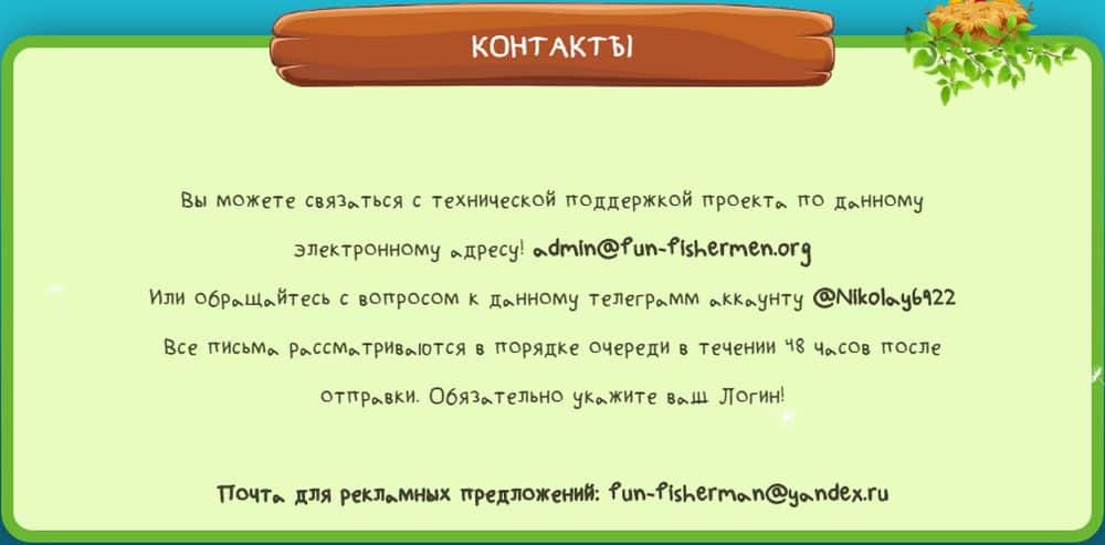Онлайн кидалы Fun-Fishermen Org не балуют пользователей контактными данными. На сайте нет ни номера телефона, ни адреса. Основное общение между игроками идет через телеграм-канал, который раскручен искусственно. Почта техподдержки, она же почта админа - фикция, через которую связаться с хозяевами невозможно. Известные контакты жуликов: