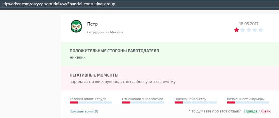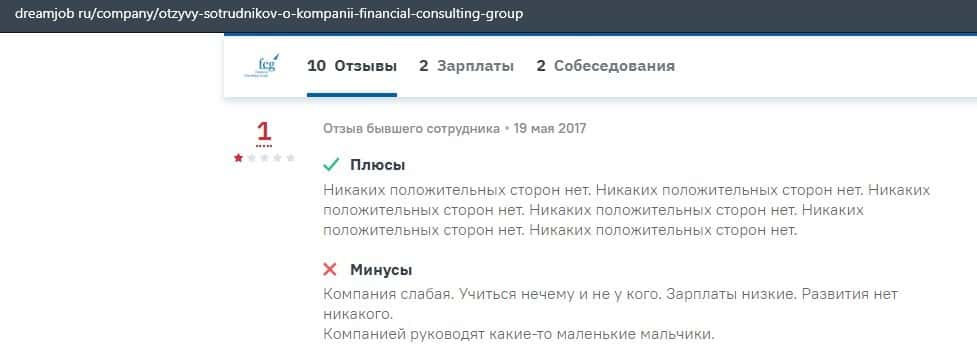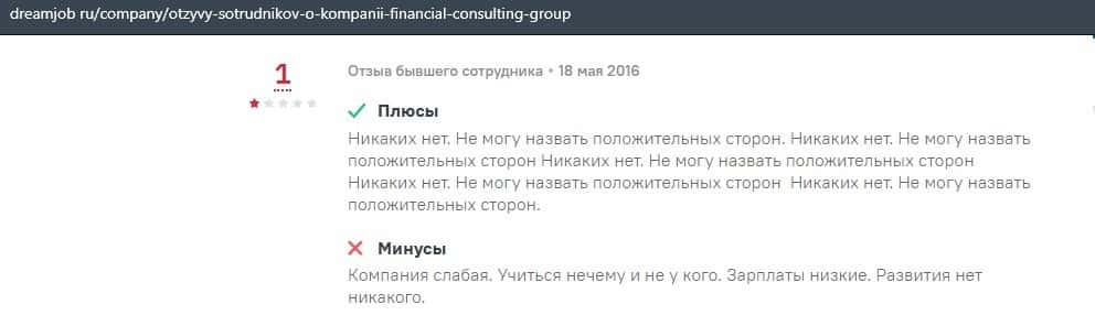 Еще один пользователь сети указывает на то, что трудоустраиваться в контору Фанэншил Консалтинг Групп нет смысла. ничего положительного для себя вы там не сможете найти.