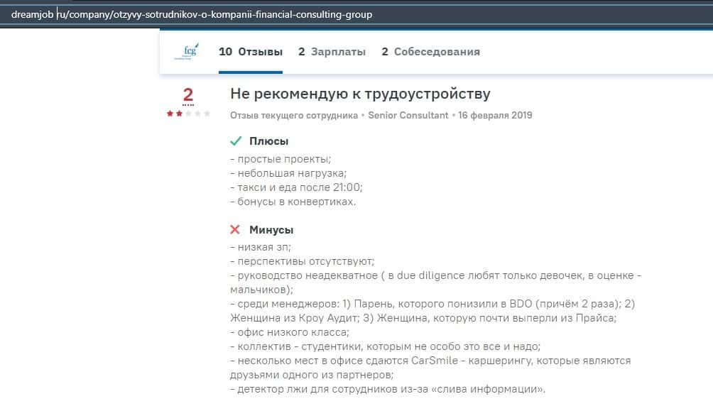Человек в своем отзыве рассказал, что если вы пойдете работать в лохотрон Фанэншил Консалтинг Групп, то вас будут ждать низкие зарплаты и слабое некомпетентное руководство.