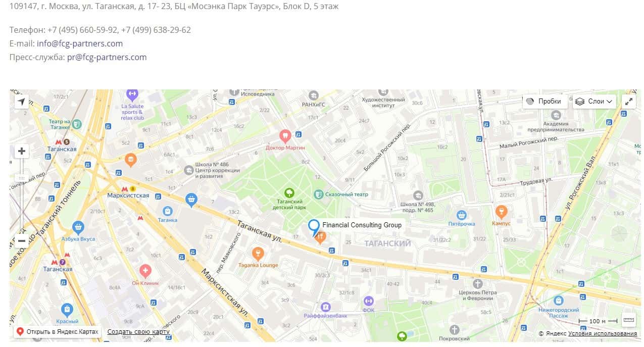 Далее представлена контактная информация конторы FCG Partners, где указан номер телефона, электронные почты и даже адрес их регистрации. Все сведения о них ниже: