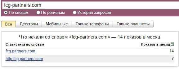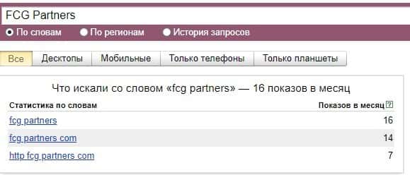 Что касается бренда "FCG Partners", то здесь они набрали по версии системы Яндекс Вордстат порядка 16 показов за последний месяц, а это показывает их низкую популярность.
