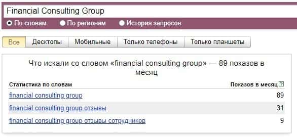 А вот с брендом "Financial Consulting Group" дела немного изменились, потому что поисковая система Яндекс смогла найти 89 показов за последний месяц.