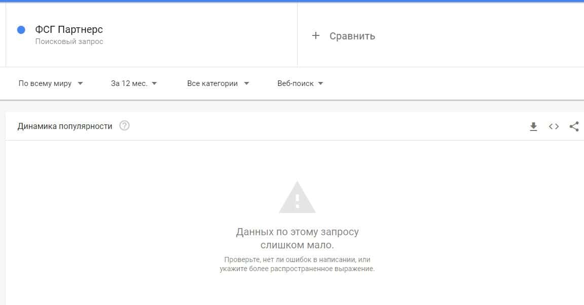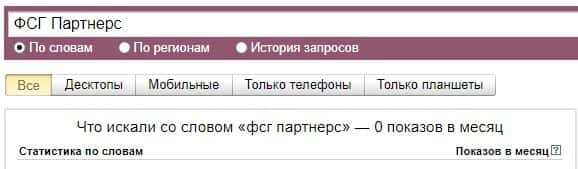 По поводу русскоязычной версии бренда "ФСГ Партнерс", но все же не слитной версии, то результаты запросов вообще пропали и скатились до 0 запросов за месяц.