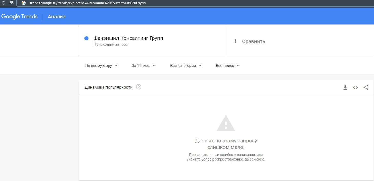Русскоязычный бренд "Фанэншил Консалтинг Групп" не был найден ни разу в поисковой системе Гугл, что показывает их ничтожную популярность в сети интернет.