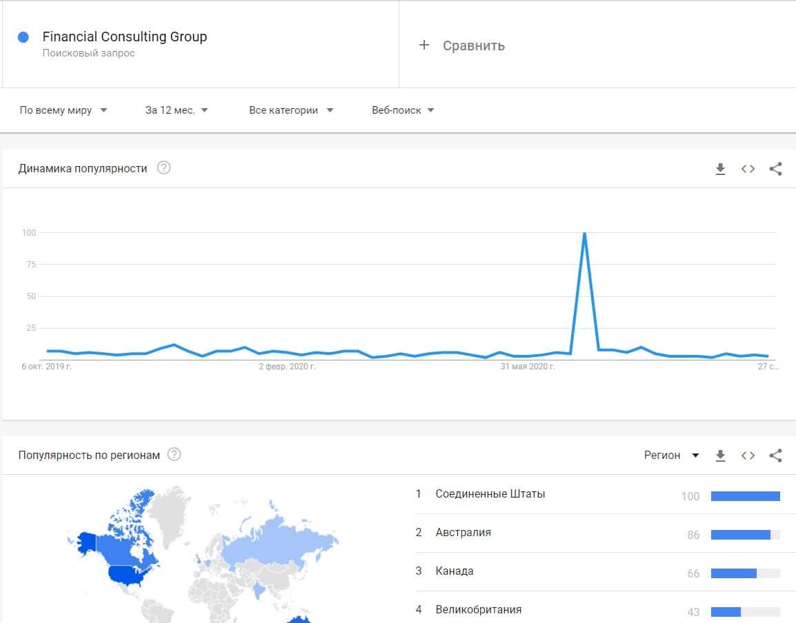 А вот бренд аферы "Financial Consulting Group" в довольно высокой популярности, так как данный лохотрон запрашивался в основном с США, Австралии, Канады и Великобритании.