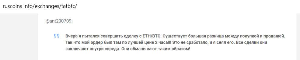 Пользователь, поработавший с псевдобиржей Фат БТЦ, оставил отрицательный отзыв на сайте Рускоинсинфо. В нем говорится, что в процессе торговли трейдер заметил, что на площадке имеют место огромные спреды, из-за чего невозможно торговать в плюс. Он сделал вывод, что биржа Фат БТЦ обманывает клиентов.