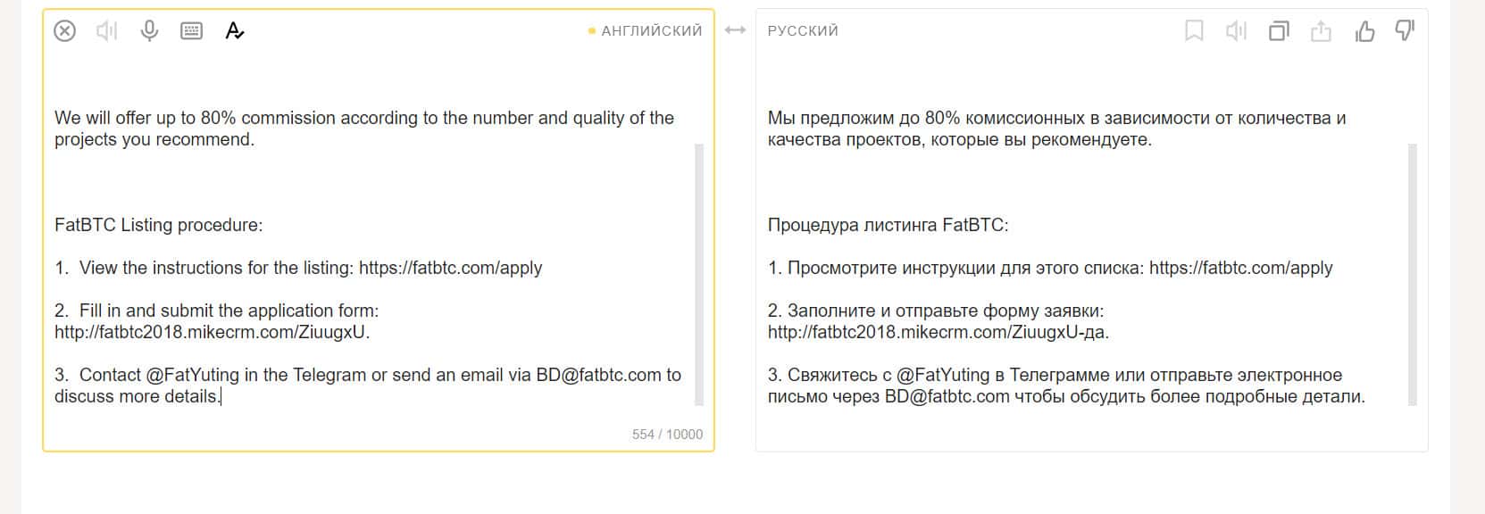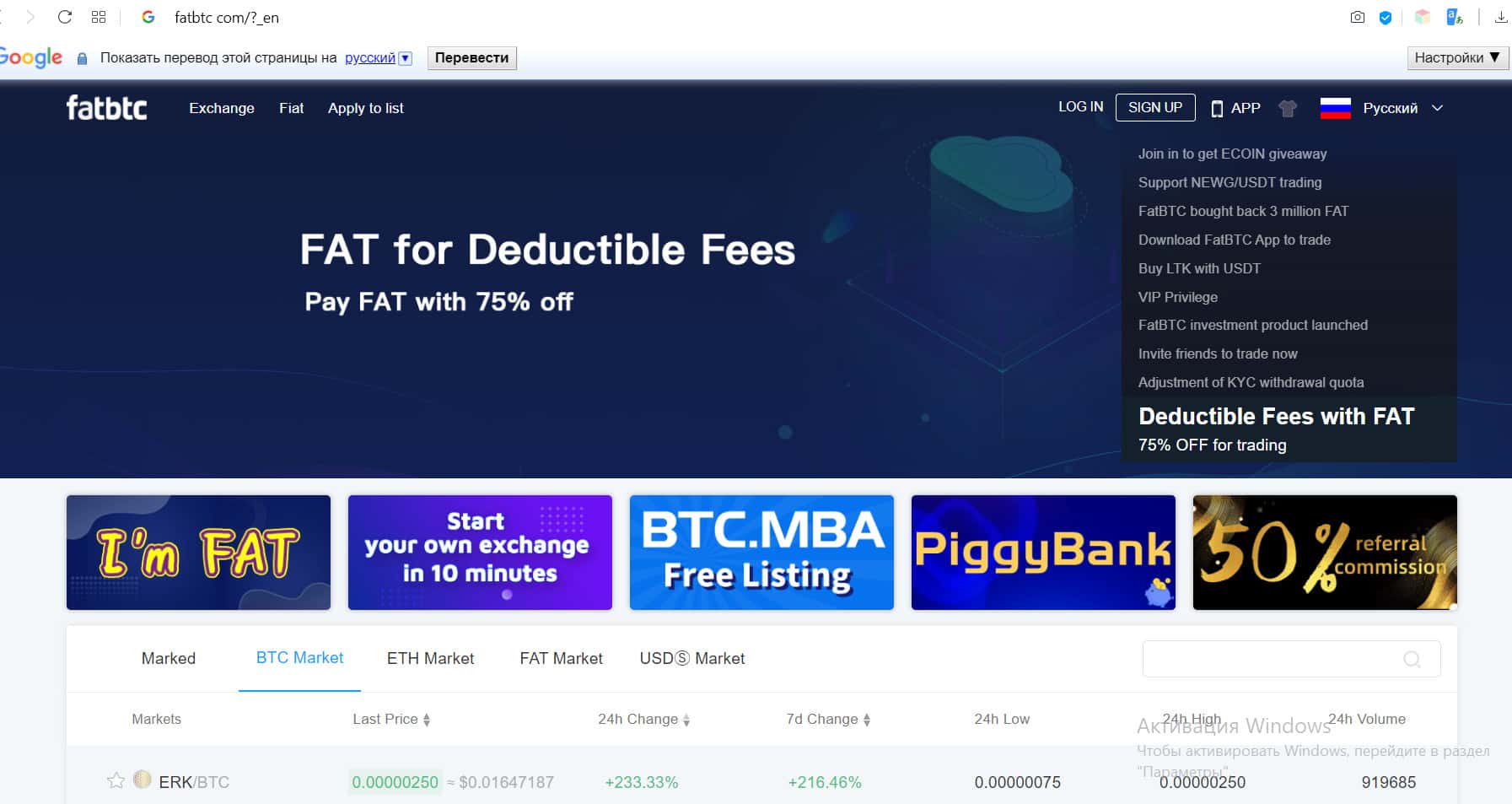 Сайт биржи FatBTC выглядит довольно посредственно, но, по крайней мере, он не забит ненужной информацией, как другие лохотроны. Здесь сразу идет перечисление токенов, которыми можно торговать и котировки. Перевод на русский язык сделан очень плохо, можно сказать, что его практически нет.