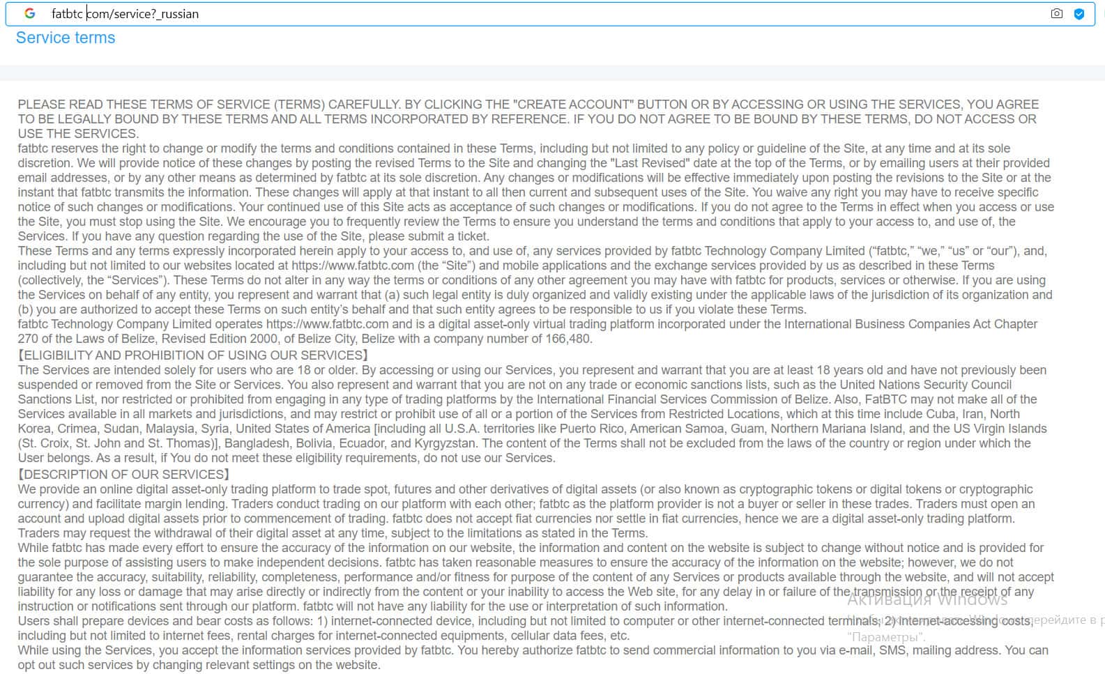 Такие документы, как клиентское соглашение и политика конфиденциальности размещены на сайте компании Фат БТЦ. Но они доступны только на английском языке, поэтому русскоязычным пользователям надо будет воспользоваться переводчиком. Надо полагать, что документы стандартные и скачаны с интернета.