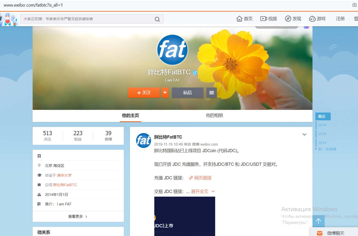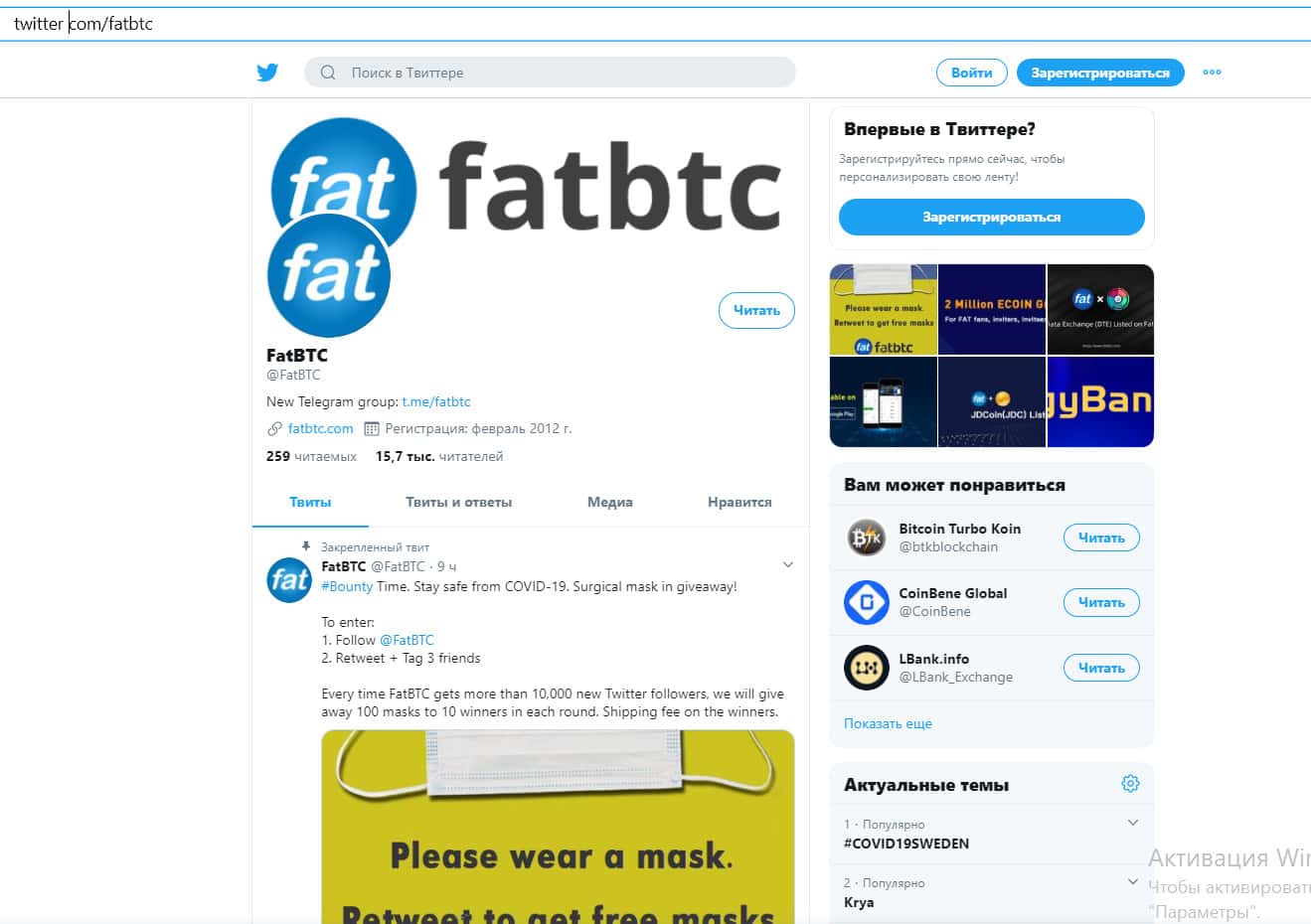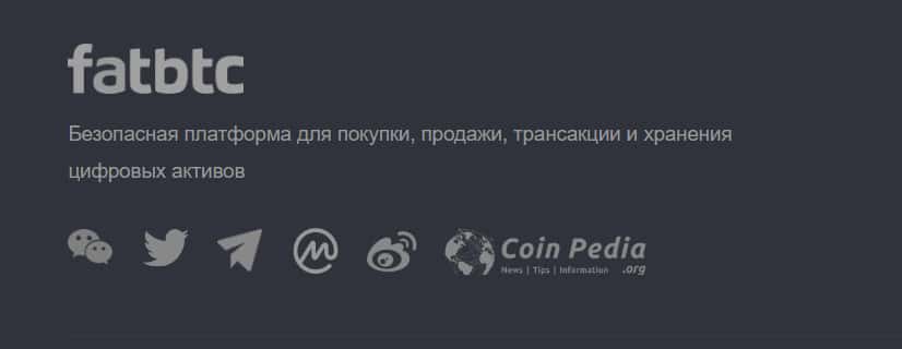 Брокерская компания Фат БТЦ имеет аккаунты в популярных соцсетях Твиттер и Вейбо, а также каналы в Телеграм и азиатском мессенджере. Помимо этого, на главной странице размещены ссылки на Коинмаркет и Коинпедию. Твиттер раскручен довольно неплохо - в нем около 15 000 пользователей.