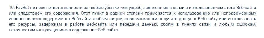 Согласно тому, что аферисты пишут в соглашении, компания Fav Bet не несет никакой ответственности за не полученную прибыль клиентом, а так же за возможные убытки.