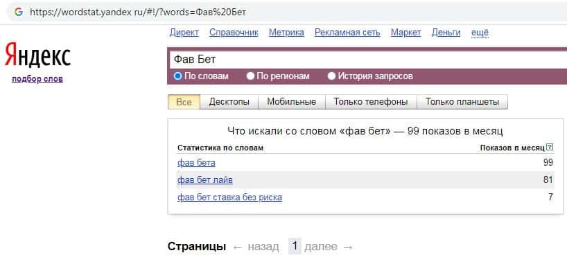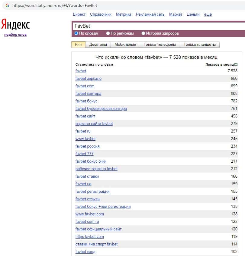 Количество запросов по бренду названия компании на русском языке с пробелом "Фав Бет" на Яндекс Вордстарт составило 99 показов за месяц.