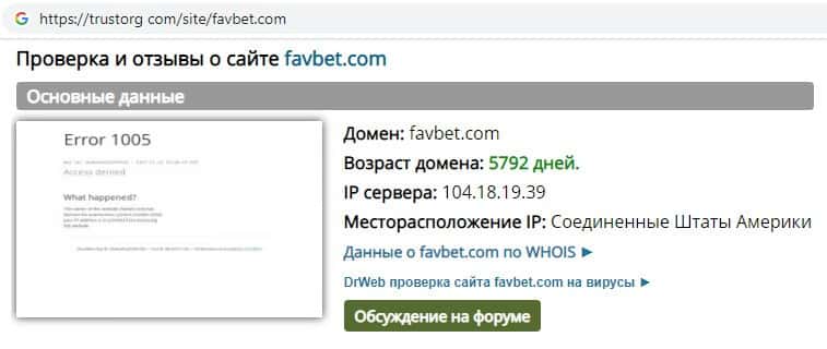 Проверка интернет-сервиса скам-конторы FavBet на trustorg com показала, что возраст домена к моменту написания статьи составляет 5792 дня, скорее всего домен купленный.