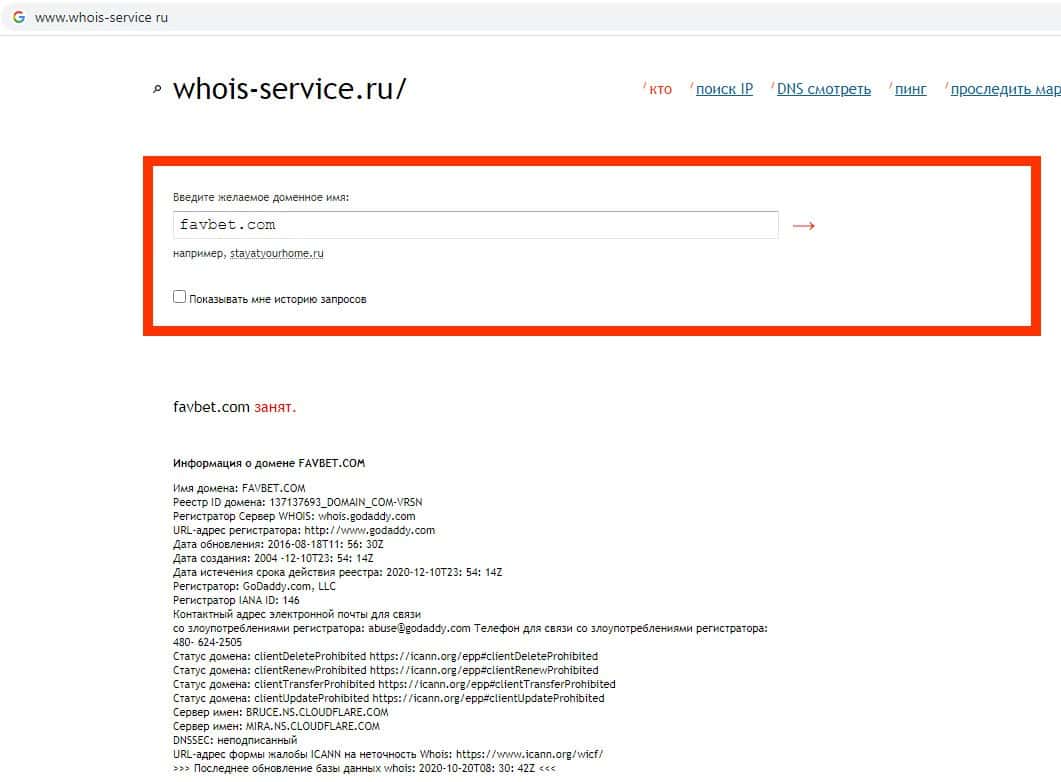Проверка срока действия домена конторы Фав Бет