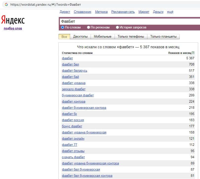 Количество запросов по бренду названия компании на русском языке без пробела "ФавБет" на Яндекс Вордстарт составляет 5 387 запросов за месяц.