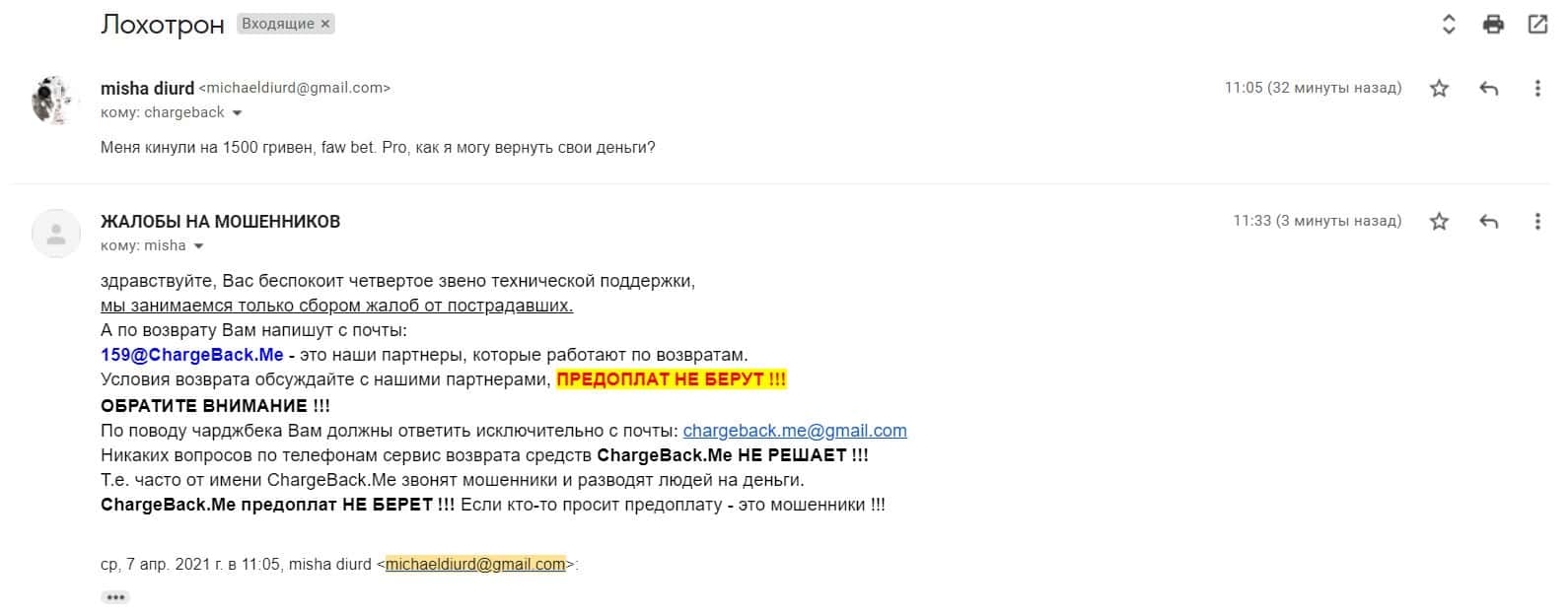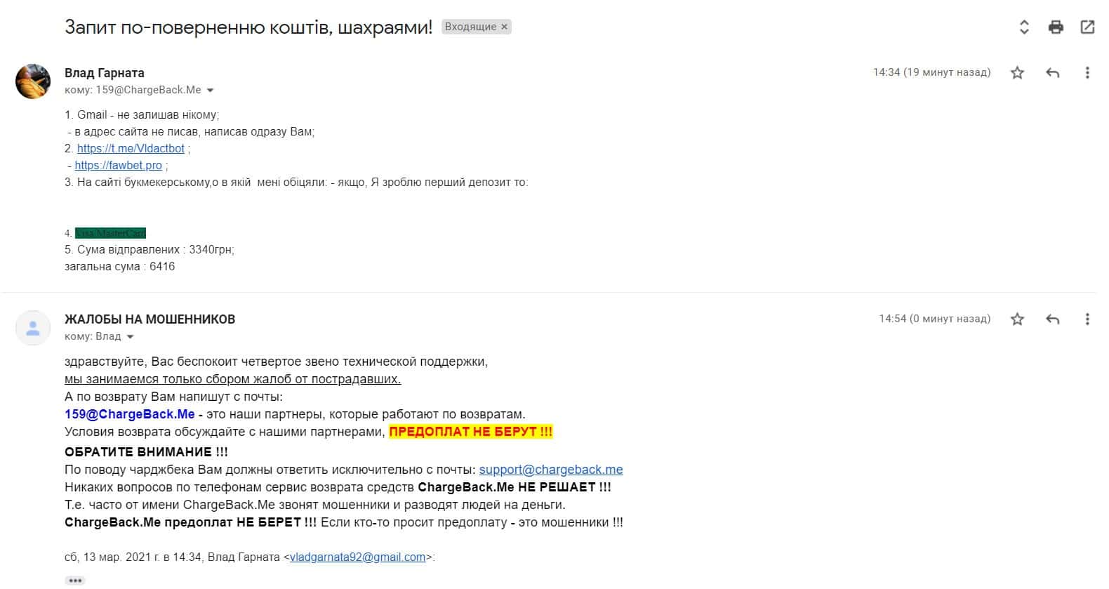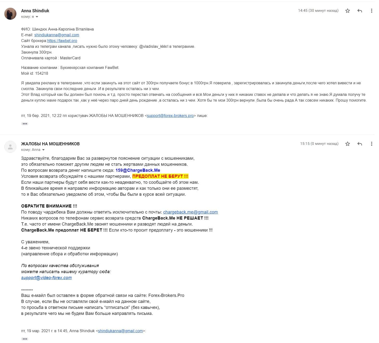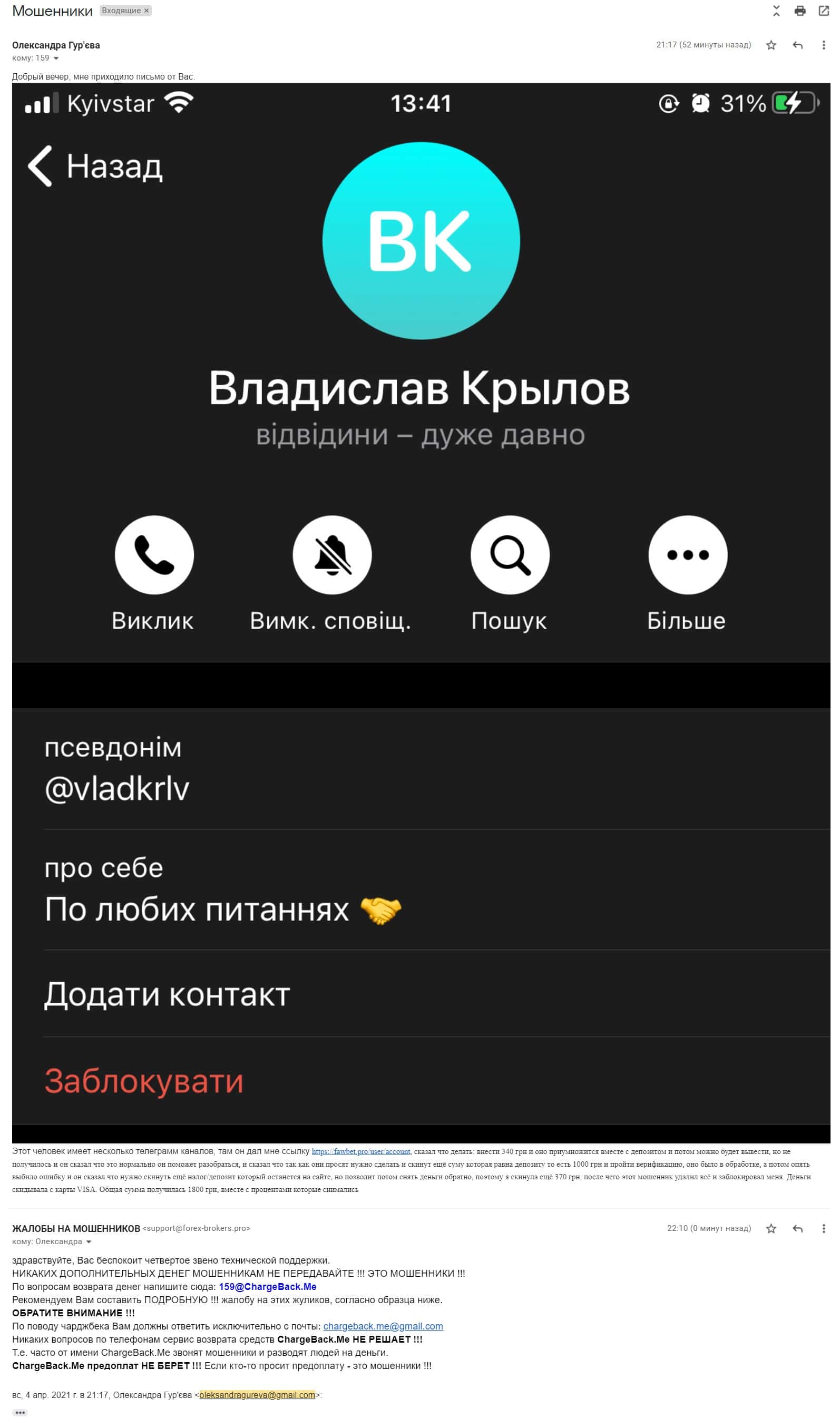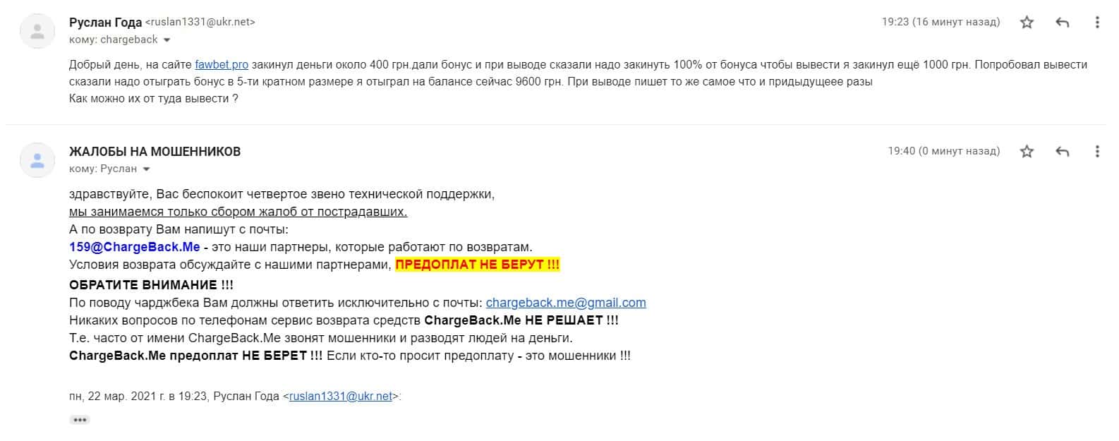 Далее предоставлена жалоба о том, как мошенники ФавБетПро выманивая денежные средства у клиента развели его на 1620 гривен.