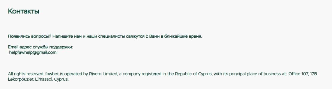 Далее представлена контактная информация аферистов ФавБет, где мошенники указали на своем сайте только электронную почту и оффшорный адрес регистрации на острове Кипр: