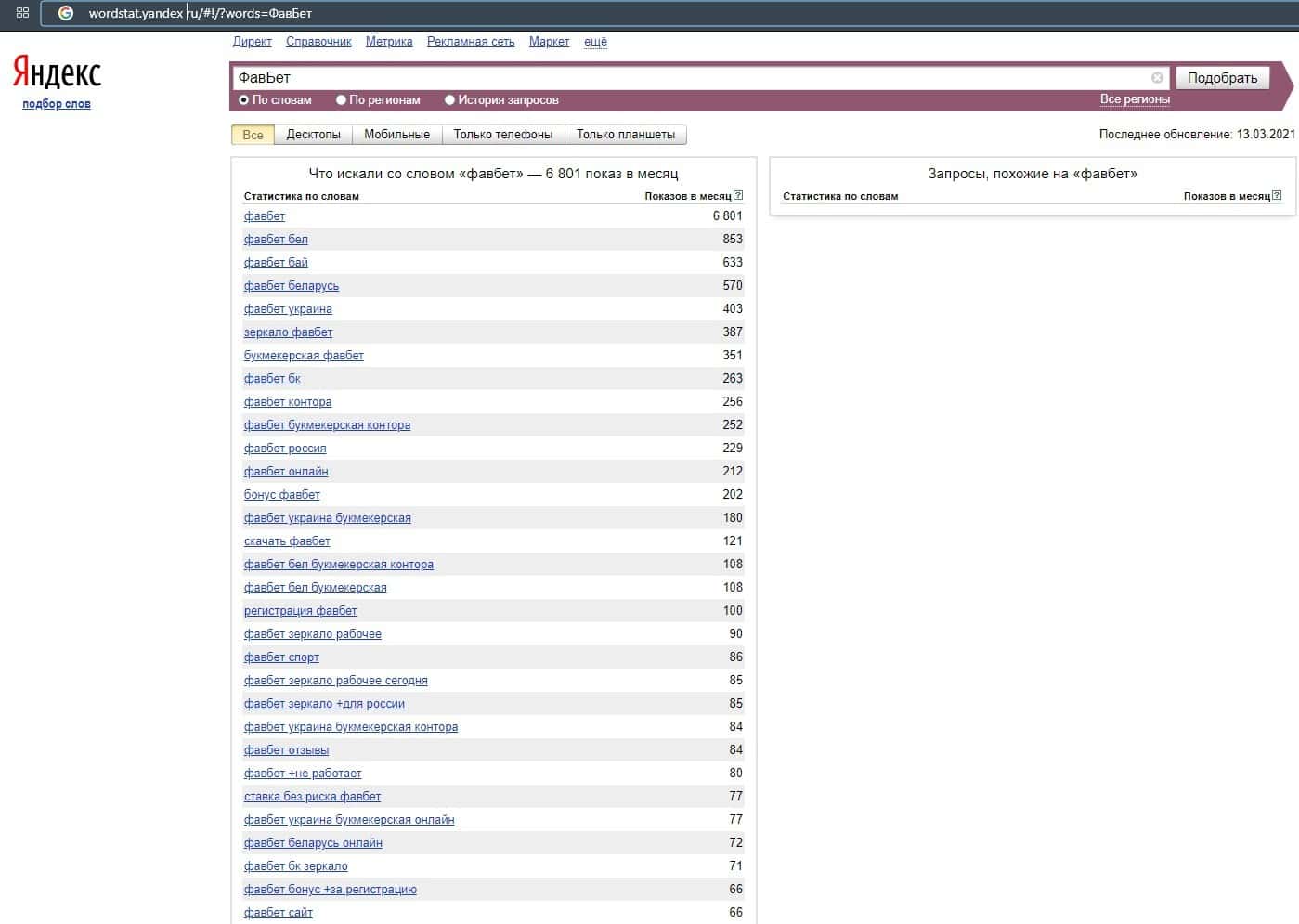По версии запросов бренда аферистов "ФавБет" в поисковой системе Яндекс есть кое-какая информация и за последний месяц было совершено 6801 запросов.