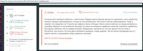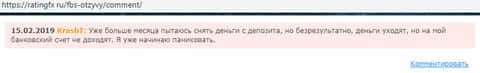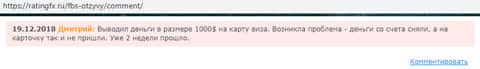 На изображении, расположенном ниже, вы можете наглядно увидеть очередной негативный комментарий в сторону лохотрона ФБС, который под предлогом технических неполадок сливает еще одному пользователю сети счет и наживается на нем. В связи с этим клиент жуликов FBS и оставил свой негативный комментарий опыта работы с шулерами ФБС на сайте фкс-рейтинг ком.