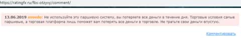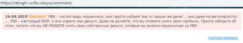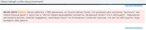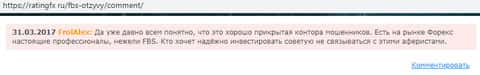 На изображении, расположенном ниже, вы можете увидеть очередной негативный комментарий от облапошенного аферистами ФБС пользователя сети интернет, который имел неосторожность связаться с мошенниками FBS, в результате чего шулера ФБС быстро и оперативно его слили при попытке вывести средства под надуманным предлогом о мошенничестве.
