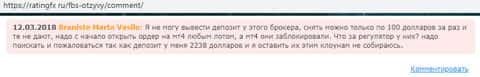 На изображении, расположенном ниже, вы можете увидеть негативный отзыв о подвальной деятельности мошенников FBS, в результате которой аферисты ФБС под предлогом своего приветственного бонуса нагло опрокинули клиентку и попытались развести ее на ввод дополнительных средств, но когда она отказала им шулера ФБС попросту заблокировали ей счет.