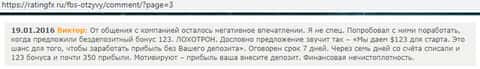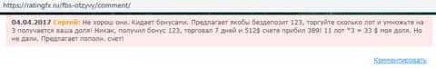 Тема бонусов у шулеров FBS является довольно таки актуальной, так как мошенники ФБС активно раздают бонусы наивным клиентам, а после под различными предлогами сливают счет и просят ввести дополнительные средства. На изображении, расположенном ниже, вы можете увидеть очередной негативный отзыв о лохотроне FBS с веб-площадки fx-rating com.