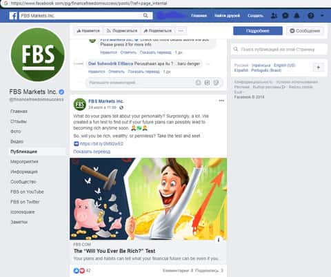 Дабы соответствовать современным трендам аферисты ФБС обзавелись страницами в социальных сетях, одной из которых стал Facebook. На данную страницу мошенники FBS определенно не поскупились, о чем говорит миллион накрученных подписчиков, о чем можно судить по активности пользователей. На изображении ниже вы можете увидеть страницу шулеров в Фейсбуке.